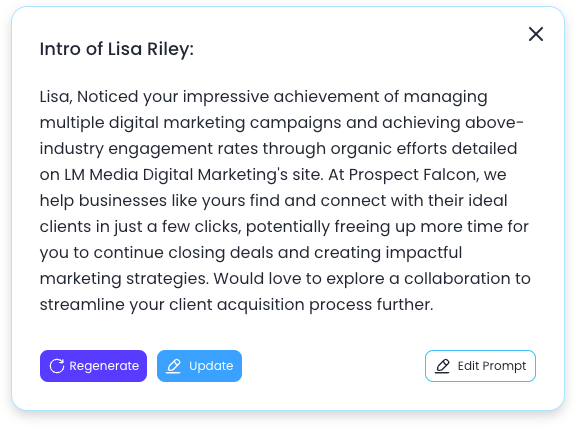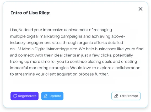 You can create personalized messages, summaries, intros, and subject lines tailored for your ideal prospects to help you better summarize and connect with the person you're trying to reach.